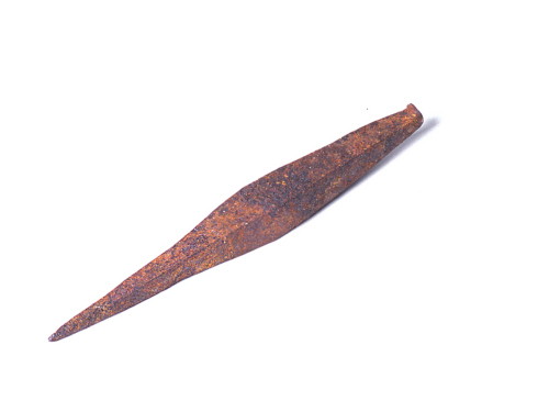Dente in ferro a sezione quadra applicabile alle scarpe. Presenta due estremità appuntite, una in modo più accentuato rispetto all'altra.