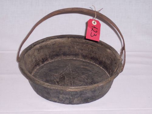 teglia in rame di forma circolare con parete leggermente inclinata verso lesterno e obliqua, orlo estroflesso tubolare e manico rigido a nastro ricopre ad arco tutto loggetto. Sul fondo appare incisa una stella a sei punte.