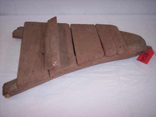 oggetto a forma triangolare con al vertice un uncino di ferro costituito da quattro traverse di legno inchiodate orizzontalmente su i due lati lunghi del triangolo; tra le due traverse più basse è inchiodato un listello di legno a forma di parallelepipedo.