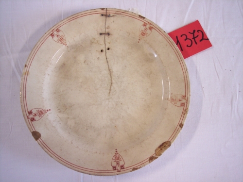 utensile in porcellana bianca a forma circolare con bordo rialzato e decorato da una doppia linea fine di colore rosso intervallata da cinque disegni geometrici con i bordi di colore rosso a forma piramidale