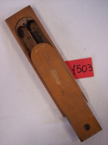 oggetto in legno a forma di parallelepipedo con una parte incavata allinterno a forma semicircolare in corrispondenza del lato corto e rettilineo lungo i lati lunghi, diviso in due settori verticalmente da un divisorio in legno; coperchio scorrevole in legno con il lato breve superiore semicircolare che va ad appoggiarsi allincavo sopra descritto e la base dritta, vicino alla base cè un foro che funge da presa.