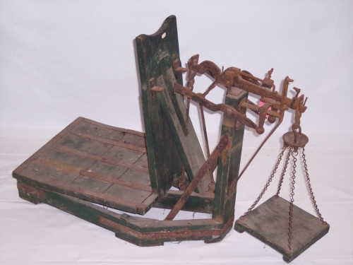 strumento costituito da una struttura lignea trapezoidale; da un piattaforma rettangolare formata da tavole di legno accostate e unite da barre di ferro; da una tavola in legno disposta verticalmente alla piattaforma che funge da biella ed è collegata con le leve in metallo montate su un'asta di legno fissata verticalmente alla struttura; da una barra graduata in chilogrammi e frazioni di chilo, collocata orizzontalmente in cima allasta di legno, sulla quale scorre un peso di forma cilindrica; da un piatto quadrato ligneo piano unito mediante quattro catenelle, che partono dai vertici, all'estremità della barra graduata