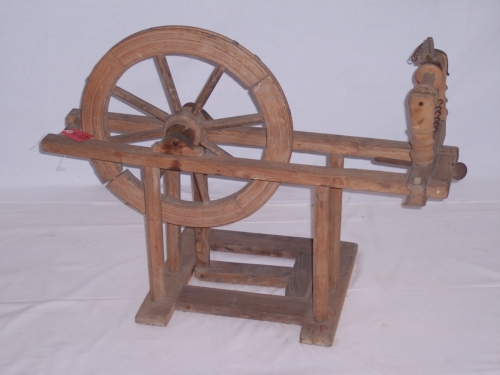 oggetto costituito da struttura lignea fata da quattro aste di legno verticali e due orizzontali, sulle quali si inserisce la biella della ruota da una parte e il dispositivo di filatura dallaltra, che è costituito da un asse portante orizzontale con madrevite, da sostegni verticali in legno tornito, dal fuso e dalla spola inserito orizzontalmente in essi; da una base rettangolare fatta da tavolette di legno distanziate fra di loro con al centro un pedale collegato alla ruota mediante la biella in legno verticale