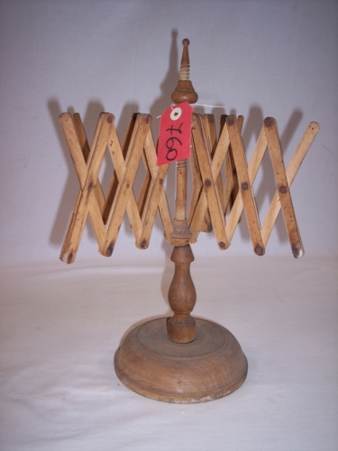 oggetto in legno composto da unasta di ferro fissata ad un alto piede circolare di legno e ricoperta dalla base fino a circa metà altezza con un asta di legno tornita, nella parte superiore dellasta di ferro è infilata una struttura lignea fatta da un asta verticale appuntita in cima e lavorata a spirale nella parte superiore su questa è inserito un pomolo in legno utile a fissare allaltezza desiderata la struttura lignea trasversale, che può ruotare. La struttura lignea trasversale è costituita da quattro bracci formati da stanghette incrociate unite tra loro alle estremità e al centro, che si aprono e si chiudono a forbice