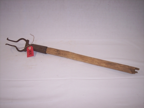 oggetto costituito da un doppio uncino con due rebbi paralleli e appuntiti e un cilindro forato per linserimento di un lungo manico in legno cilindrico