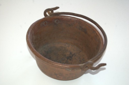 Recipiente in rame di forma svasata con fondo tondeggiante e bordo superiore ripiegato; completo di manico in ferro ad arco, le cui estremità sono inserite nei due anelli laterali, fissati con borchie in rame al contenitore.