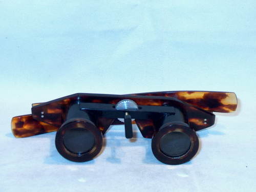 Montatura di occhiali. Al posto delle lenti sono posizionati i due tubi di un binocolo. Costruiti in materiale plastico in finta tartaruga