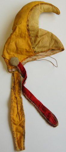 fasce di stoffa gialle e verdi (due per lato) decorate da una fettuccia con filamenti dorati sovrapposta alle cuciture laterali e la bordatura inferiore. Corno riempito di ovatta e piegato in avanti. Piccolo spacco sul retro. Ai lati ci sono due grandi bottoni #botòi# rivestiti in stoffa dai quali partono due fasce (a destra rossa e a sinistra gialla)decorate anch'esse con la stessa fettuccia. Fodera in cotone bianco tranne dietro i bottoni dove è in cotone rasato lilla. Al centro della fodera è stata cucita una stoffa con disegnato il marchio del cappello dal quale è stata riciclata. Il berretto viene fissato alla testa grazie ad un elastico.