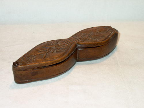 Astuccio in legno dolce a forma di otto. L'alloggiamento dell'occhiale si libera facendo scorrere il coperchio superiore di lato.