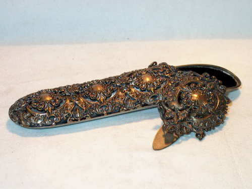 Astuccio a chàtelaine in ottone argentato. Sia il fermaglio, sia il corpo sono traforati e incisi.