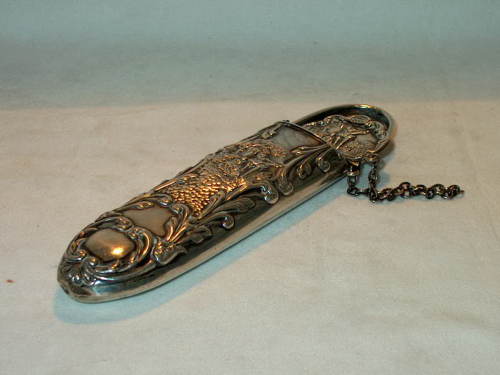 Astuccio a chàtelaine in argento sbalzato e raffigurante scene romantiche. Il gancio è con i punzoni dell'argento: Birmingham, 1905.