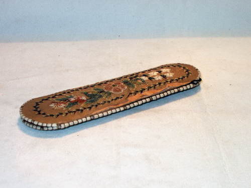 Astuccio in sughero di forma ovale, con ricami floreali policromi.
