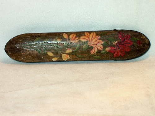 Astuccio in legno dipinto di forma ogivale con terminale basculante. Su una faccia: dipinte viole e myosotis, laccatura. Sull'altra:dipinti garofani e "SPA", laccatura.
