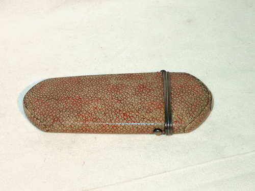 L'astuccio dall'apertura longitudinale basculante, ha una struttura tubolare lignea, coperchio incernierato e apertura a pressione. E' rivestito in "galuchat" rosa, con una piccola fascia scanalata d'argento che ne maschera la chiusura e con una targhetta d'argento, destinata all'incisione di un monogramma, sull'estremità del coperchio. Poiché tale targhetta è senza alcuna incisione, è probabile che l'astuccio non sia appartenuto a nessuno. Probabilmente doveva contenere un occhiale in argento con stanghette a ripiegare e con lenti montate in cerchi di corno alla Martin. Il pregiato rivestimento in pelle di squalo, sottoposta a speciali trattamenti di concia e di verniciatura, inventati dall'artigiano parigino Galuchat, consente di collocare l'astuccio in un ambito francese della seconda metà del settecento.