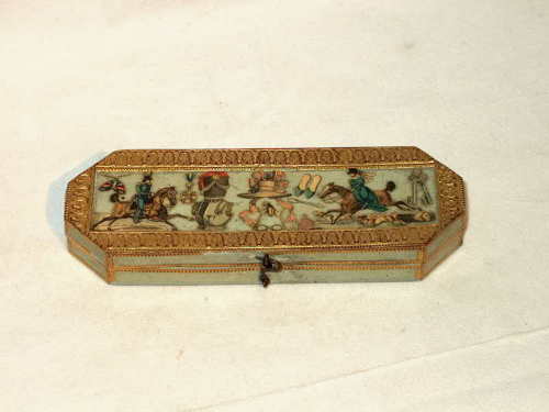 Astuccio a due corpi, in cartapesta. E' ricoperto con carta bianca e rifinito con modanature in lastre d'oro. Molto simpatico il coperchio sul quale sono incollate figurine ritagliate che rappresentano "un combattimento d'amore": a sinistra l'uomo a cavallo si dirige verso il centro, andando così incontro alla donna-ammazzone che proviene da destra e che, anche lei al galoppo, corre verso il centro. Intorno ai due personaggi i simboli dei loro rispettivi compiti e caratterizzazioni sociali. Più dettagliatamente a sinistra: una farfalla che svolazza, una medaglia e un'uniforme; a destra: le chiavi, un paio di pantofole, un cucchiaio, i cani (simbolo di fedeltà), un gomitolo con i ferri; al centro: un cappello da donna, uno scarabeo (?), e un paio di occhiali a stanghette ripiegabili.