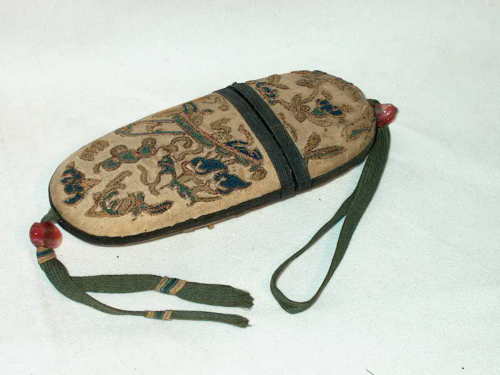 L'astuccio è in stoffa color nocciola con ricami policromi.