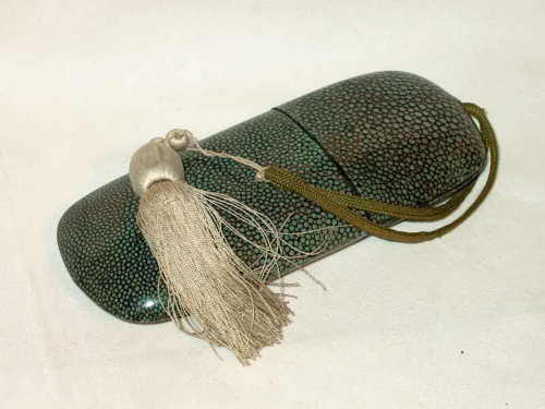 Astuccio originale in galuchat. All'esterno è annodato un fiocco in seta color avorio.