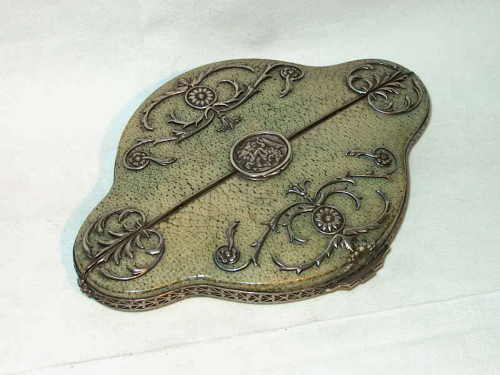 La mancanza di punzoni ci fa pensare che l'opera sia di manifattura francese anche se alcuni stilemi ricordano le opere inglesi. Magnifico astuccio di galuchat verde che ha la stessa forma della lente contenuta ed esternamente reca una serie di applicazioni in argento a motivi floreali. Il pulsante di apertura raffigura probabilmente la testa di Zeus.