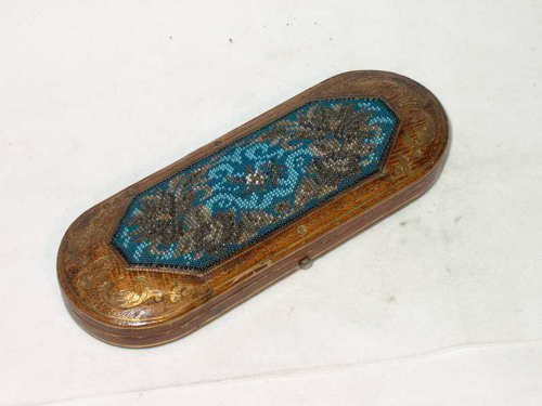 L'astuccio è di forma ovale con contorni color oro e al centro una lavorazione di perline.