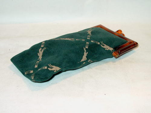 L'astuccio, che serve da contenitore ad un binocolo, è in stoffa verde con impressioni grige e porta una chiusura in plastica color ambra ad incastro.