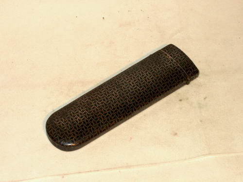 L'astuccio è in metallo di forma tronco-ovale e lavorazione a niello.