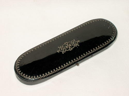 L'astuccio è di cartapesta nera, laccata con lavorazioni in rilievo sul coperchio. Foderato di velluto viola scuro.