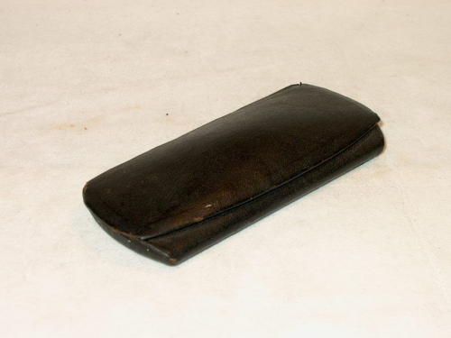 Lastuccio di forma quasi rettangolare ha lanima in metallo, è ricoperto di pelle colorata in nero ed è foderato con velluto viola scuro. Nella faccia anteriore timbro impresso: Prescott et Son / 9, Merrion Row / Dublin.