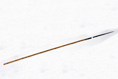 Freccia con punta di legno dipinta con pigmenti a formare anelli rossi e neri. La punta della freccia è spezzata. Il bastone è realizzato con albero di bambù.