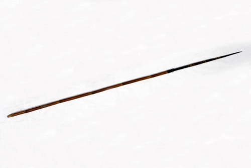 Freccia con punta di legno, il bastone è realizzato con la pianta di di bambù. La punta è dipinta a formare nove anelli chiari. Strumento di guerra.