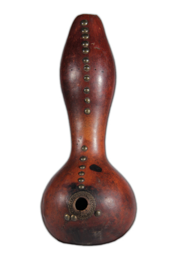 Pipa ad acqua decorata con chiodi e filo di di rame. "The water pipe made of a small calabash with a hollow reed on which a small clay bowl is placed, which is mostly used for the purpose in this area, goes round from mouth to mouth among gatherings of either men or women." (rif. Achim von Oppen, "Term of Trade and Terms of Trust: the history and contents of pre-colonial market production around the Upper Zambesi and Kasai", in C6, The utility of imported goods: 213. Studien zur Afrikanischen Geschichte Bd. 6, LIT Verlag. 1992) "..the "mutopa", as soon as its owner takes the first puff, runs from mouth to mouth without distinction of classes, and when it returns to him and if he still has a piece of tobacco, he has to add it in order to take a new puff and let it go round again...(rif.Dias de Carvalho 1890: 677 Northern Chokwe/Lunda)