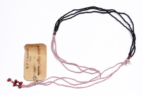 Collana di perline colorate (rosa, nere, rosse, blu), filo di cotone. Descrizione etichetta originale: Archivio St. Petrus Claver Sodalität Triest (Sodalizio di San Pietro Claver per le Missioni Africane. Nr 3908.
