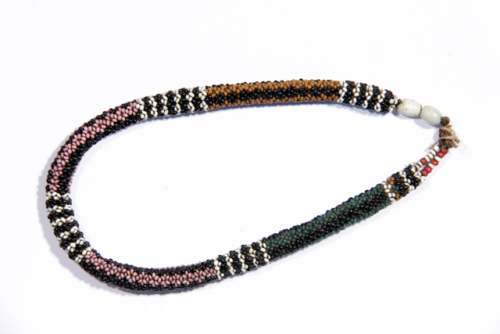collana di perline nere, bianche, rosa, verdi e ocra.