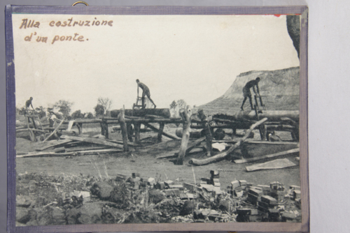 Il cartoncino riporta la scritta a mano: "Alla costruzione d'un ponte".