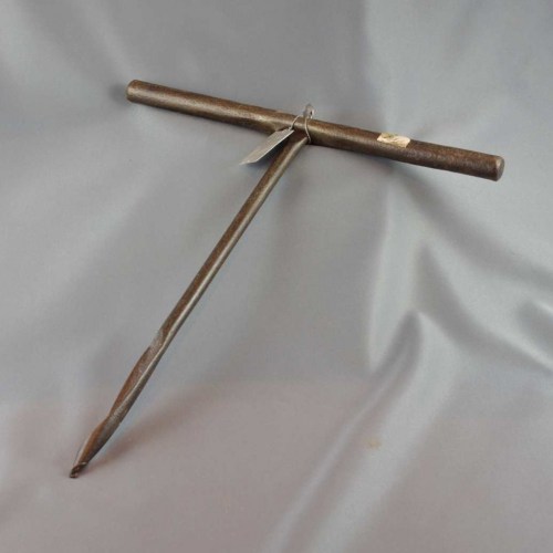 Trivella interamente metallica,con asta a sezione quadrangolare e punta elicoidale. L'impugnatura presenta forma cilindrica. In essa si infila l'asta dello strumento.