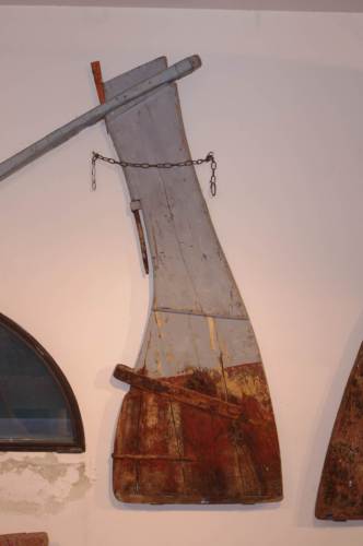Timone di #topo# veneziano, completo di #rigòla, làme, màscolo e fémena#. Conserva le tracce della verniciatura originaria. Da notere il vistoso, elaborato rinforzo dipinto di verde della testa, alla cui sagomatura non è stato estraneo qualche intendimento estetico. La #rigòla#, formata da un tubo di ferro, sicuramente non è originale, ed è stata aggiunta privilegiando la funzionalità all'eleganza, dopo le modifiche di rinforzo.
