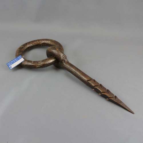 Soprta di chiodo ad occhiello a sezione grossomodo quadrangolare con bordi smussati, al quale è collegato all'estremità superiore un anello a sezione circolare nel quale si faceva passare la corda. Da notare la particolare lavorazione a zigrinatura molto grossa che caratterizza la parte che penetrava nel legno, la cui funzione era di offrire la maggiore resistenza possibile alla trazione dagli ormeggi.