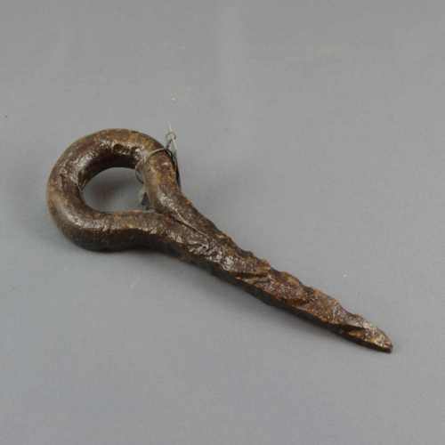 Specie di grosso chiodo ad occhiello (dove veniva fatta passare la corda per tendere il sartiame. Da notare la particolare lavorazione a zigrinatura che caratterizza la parte che penetrava nel legno, la cui funzione era di offrire la maggiore resistenza possibile alla trazione esercitata dal sartiame.