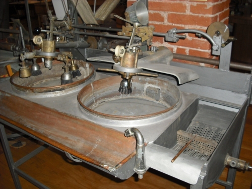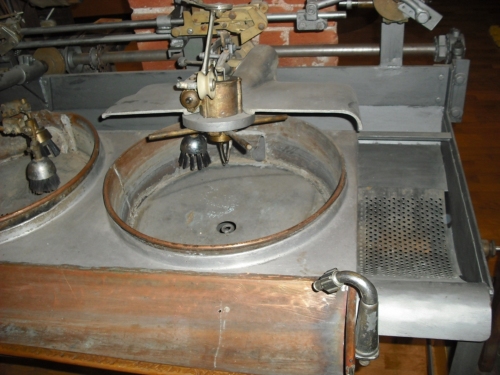 Macchinario formato da moduli. Un modulo è composto da una vasca rotonda in rame con il diametro di circa 50 cm ed alto circa 20 cm. Un particolare sistema ad ingranaggi fa ruotare le quattro spazzole sistemate al centro che raccolgono le bave dei bozzoli e le fa aderire una all'altra. Perchè possano raccogliere la bava si deve mantenere l'acqua all'interno della vasca ad un livello tale che consenta alle spazzole solo di sfiorare la superficie dei bozzoli che si trovano all'interno. Nella parte posteriore della bacinella c'è un foro dal quale escono le crisalidi. Escono solo le crisalidi perchè il foro è ricavato nella parte più bassa della vasca ed è dotato di una protezione che non fa passare i bozzoli. Ogni vaschetta è dotata di un sistema automatico di regolazione del titolo alla cui base si trova un tendifilo collegato ad un contrappeso che veniva regolato dai meccanici in base al titolo del filato in produzione. Poichè la trazione esercitata dal filo è in qualche modo proporzionale al suo titolo, il contrappeso si alza od abbassa in base alla trazione che subisce e trascina nel suo movimento una leva. Questa leva, a sua volta, alza od abbassa due leve verticali che a loro volta interagiscono sulle spazzole o sull'aspo fermando o le une o l'altro a seconda del titolo o troppo grosso o troppo sottile. La bacinella vera e propria è formata da dieci vasche (dieci moduli) che vengono accudite da una sola #filera#. A volte due #filere# accudivano tre bacinelle. Il vascone risulta lungo una decina di metri. Lungo la parte posteriore corre un canale, largo una decina di centimetri, che serve per ricevere i bozzoli esausti che escono dai buchi delle bacinelle e convogliarli, tramite un rivolo d'acqua, in una apposita vasca di raccolta (forata per permettere lo scolo dell'acqua) collocata all'estremità del vascone. Una paletta forata raschia sul fondo della vasca e fa cadere il contenuto in un secchio posto per terra. Un altro canale della stessa larghezza e posto nella parte anteriore del vascone serve da deposito dei bozzoli da utilizzare durante la giornata. Man mano che i bozzoli diminuiscono vengono incrementati dalla #filera# con degli altri contenuti in un cesto in rete metallica posto ai piedi del vascone. Le prime bacinelle erano dotate di grandi cassoni posti in alto (contenenti bozzoli) e, attraverso dei tubi, facevano cadere automaticamente i bozzoli in ogni vaschetta. I risultati, però, non furono quelli sperati, il meccanismo funzionava male e quindi vennero tolti.