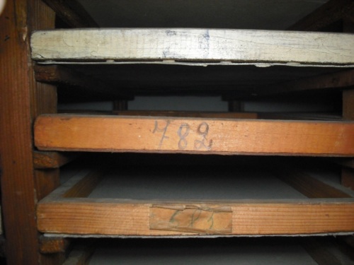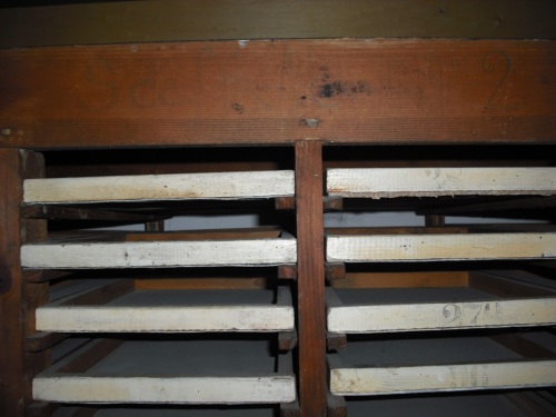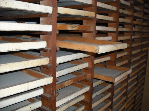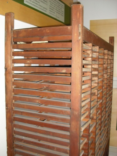 Struttura che sostiene 264 cassetti. I cassetti formano 22 righe e 6 colonne da un lato, e altre 22 righe e 6 colonne dall'altro.