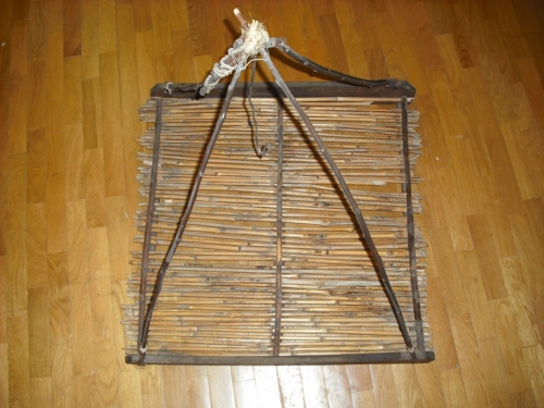 Quadrato piano con struttura ai lati per reggere una specie di gancio. L'oggetto, infatti, veniva appeso.