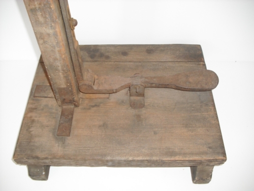 Da una pedana sale un elemento verticale dove c'è un palo orizzontale e due rotaie. In quella inferiore scorre un meccanismo regolato con un pedale a piede che alza e abbassa un perno dove è fissato un cilindro. Nella rotaia superiore un altro cilindro si può spostare a mano e con una farfalla si fissa.