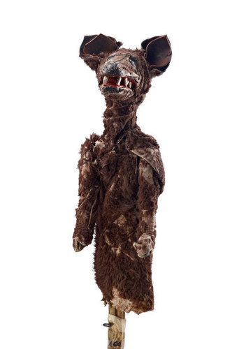 rappresentazione del Lupo, personaggio della fiaba di Cappuccetto Rosso. L'aspetto volutamente orrifico è ottenuto in particolare grazie alla realizzazione della bocca con le fauci tinte di rosso e i grandi denti ben visibili. Anche la pelliccia vera di montone rende immediatamente riconoscibile l'identità animale del burattino