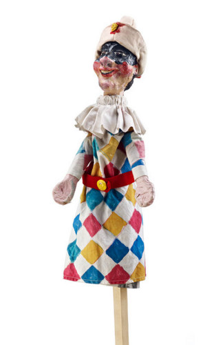 - FUNZIONE E MODALITÀ D'USO Maschera di Arlecchino in spettacoli di burattiniIl burattino veniva animato tramite il movimento della mano e del braccio del burattinaio. Il dito indice di questo era inserito nel foro presente nella testa del burattino, mentre il pollice e il dito medio entravano nelle braccia allungate e vuote allinterno del burattino, attraverso coni di cartone opportunamente fissati alla giuntura del braccio