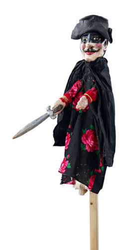 Rappresentazione del Brigante, personaggio generico utile per lo svolgimento di diversi copioni e in particolare per gli sviluppi basati sulla contrapposizione tra il bene e il male. Il volto è caratterizzato dalla maschera nera dipinta direttamente sopra gli occhi e un sorriso arricchito da baffi sottili che danno eleganza e gentilezza al personaggio. Importanti gli accessori come il cappello nero a falda larga e la spada alla mano destra. Il costume è composto da una veste con fantasie vistose e un mantello nero.