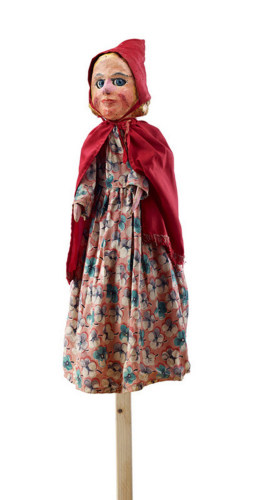 Rappresentazione del personaggio di Cappuccetto Rosso caratterizzato da un mantello rosso bordato con passamaneria frangiata e un cappuccio anchesso rosso, entrambi fissati al collo da un nastrino in tinta. Da sotto il copricapo spunta una capigliatura bionda ottenuta modellando e dipingendo di giallo direttamente la cartapesta. Sul volto spiccano le guance di una sfumatura più accesa di rosa e gli occhi azzurri sgranati (senza palpebre) e mobili orizzontalmente. Il costume è composto da un corpetto e gonna realizzati con una stoffa a fantasia fiorata.