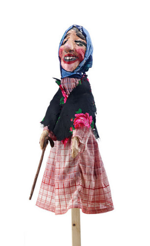 Rappresentazione del personaggio della Strega maledetta, moglie di Arlecchino. I tratti caratterizzanti della donna anziana e sgradevole sono i grossi denti ben in vista, il naso sporgente, gli occhi tratteggiati con inclinazione allingiù, il fazzoletto sul capo e lo scialle sulle spalle. Il bastone agganciato alla mano destra diventa strumento per percuotere, vista la mobilità in senso verticale (alto e basso) del braccio. Il costume del burattino è composto da una veste di stoffa a quadretti, su cui poggia sulle spalle uno scialle nero di stoffa di lana stampata con rose. La testa è coperta da un foulard a fantasie azzurre chiuso stretto sul collo.