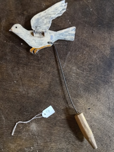 riproduzione di un uccellno che simula il volo con ali articolate ch esi aprono e chiudono. Il volatile è totamente bianco, con eccezzione dell'attaccatura del becco e delle zampe dipinti di giallo. Sulla parte bassa e posteriore è agganciato il ferro che funge da supporto e termina con una impugnatura di legno