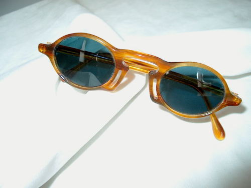 Gli occhiali, in materiale sintetico colorato in marrone, hanno il nasello incorporato e le lenti, ovali e piccole, sono colorate in grigio - azzurro. [Descrizione estratta dal database del Museo dell'Occhiale].