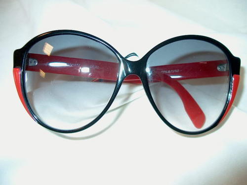 Gli occhiali, in materiale sintetico, sono colorati in rosso e nero. Le lenti, grandi, sono colorate in grigio, degradante. Vi sono punzoni sull'astina sinistra e sull'astina destra. [Descrizione estratta dal database del Museo dell'Occhiale].