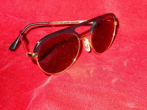 Gli occhiali sono in materiale sintetico a due colori: la parte superiore ed i terminali delle astine sono di colore nero; il resto color oro. Le lenti sono colorate in grigio-azzurro. Sull'astina destra: G. GIANNOTTI MADE IN ITALY. Sull'astina sinistra: GA 141 2. [Descrizione estratta dal database del Museo dell'Occhiale].